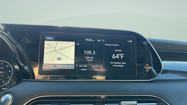 - Radio: AM/FM/MP3 Premium Audio System -inc: 630-Watts, 12-speaker harman/kardon premium audio system, QuantumLogic surround sound, Clari-Fi music restoration technology, 10.25" color touchscreen, on-board navigation, traffic flow including incident data via HD Radio (HERE), SiriusXM, HD Radio, Apple CarPlay & Android Auto, Blue Link Connected Car, driver talk (in-car intercom), quiet mode, multiple device connection (up to 2 devices), USB/Auxiliary input jacks, rearview monitor w/parking guidelines, Bluetooth® hands-free w/wireless audio streaming and wireless device charging (for Qi-supported devices)