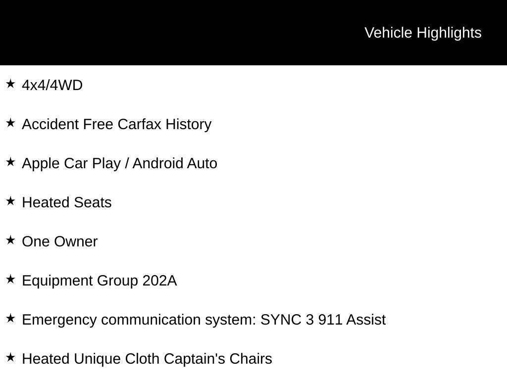 - SYNC 3 Communications & Entertainment System -inc: enhanced voice recognition, 8" LCD capacitive touchscreen in center stack w/swipe capability, AppLink, 911 Assist, Apple Car Play and Android Auto compatibility and 1 "A" and 1 "C" USB ports in the media hub