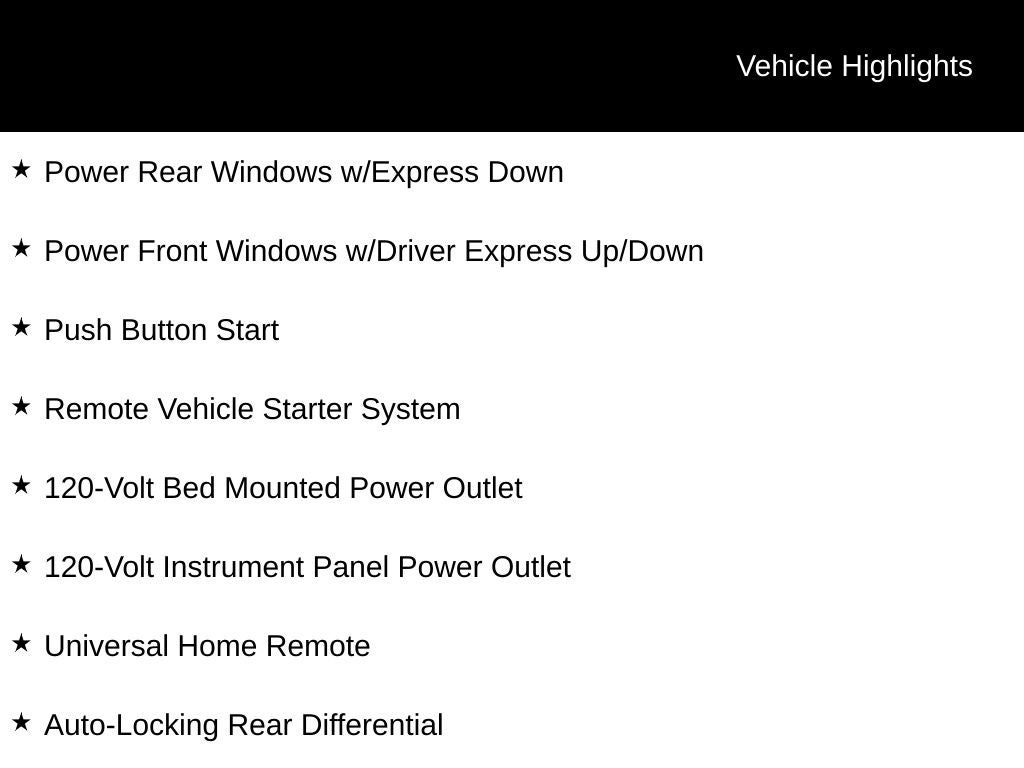 - LED Cargo Area Lighting located in cargo bed activated with switch on center switch bank or key fob